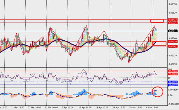 本领面:澳元兑美元正在H4级别来到上方压力带角落,价钱偏离48日众空分界线,但因为超涨,MACD量能柱依然造成阶段性顶背离,而且和双线进一步亲昵死叉,他日可以会向下回调。