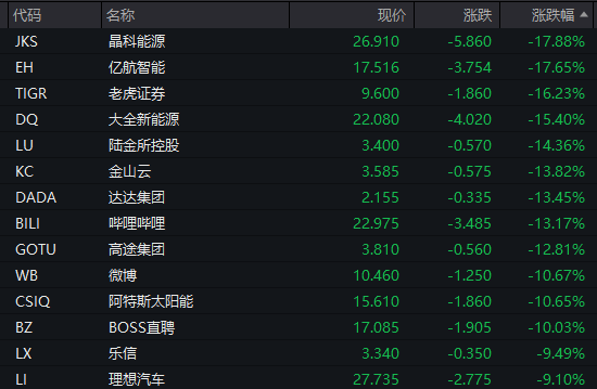 个股方面,晶科能源、亿航智能、老虎证券跌超16%,哔哩哔哩跌抢先13%,微博跌超10%,空思汽车跌超9%,蔚来、阿里巴巴、小鹏汽车跌超6%。