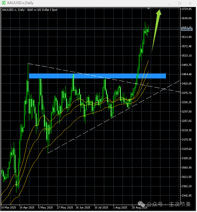 无论从哪个角度,这回黄金向上冲破横盘区间,都是获胜的,并且冲破之后的相接性相当好。目前正处正在中期单边上涨流程中。从图中通道上沿的角度来看,接下来几天正在3620相近会遭遇一个阻力。但仅动作危险指导,终究这个通道的有用性还没取得验证。当然,即使崭露受阻,也只是一次上涨流程中的寻常回调。Update: 2025-9-14