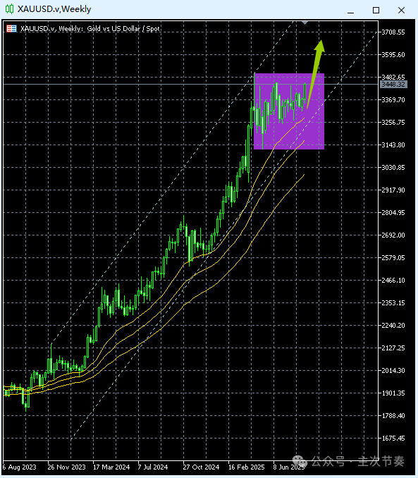 8月月线图收出较大的阳线,且险些是秃子阳线。这是一个限度上涨动能再次占优的信号,那么接下来的9月鲜明会考试打击新高。看待月线图而言,之前几个月的高位盘整算不上了然的回调流程,那么至今依旧以为还正在3浪流程中,并不是4浪后的5浪。黄金周线)this.width=500 align=center hspace=10 vspace=10 rel=nofollow/>