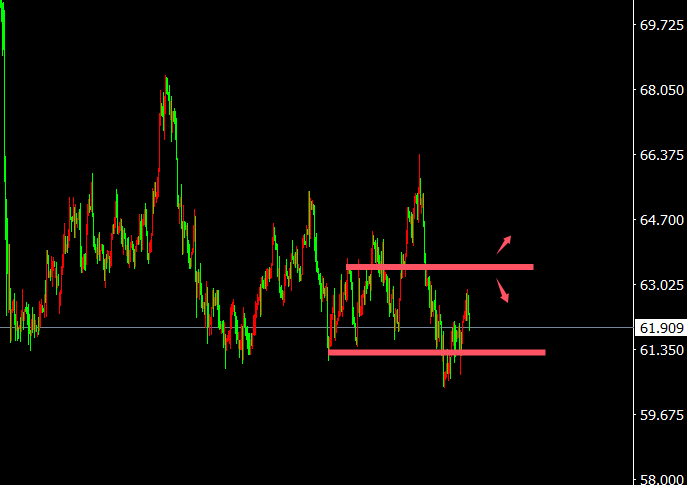 原油周三处于区间波动,当天最低62,最高62.8,日线,日线看油价受阻于中轨后回调,处于下行通道,今上方眷注63能否上破,四小时线,呈区间波动,小时线,偏波动下行,下行先看61,下破则看60,综述日内操作思绪以波动为主,先看63-61区间,破位则看顺延