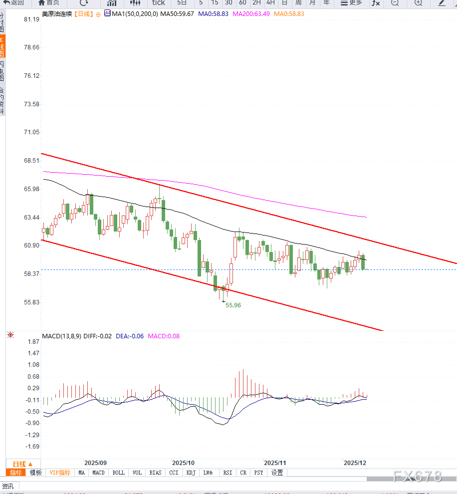 其余,布林带中轨相近的59-60美元区间成为众空夺取的枢纽点位,一朝日线收盘络续跌破中轨,下方或许从新测试57.5与56.8两个撑持区。全体来看,美原油目前处于高位振撼后的调理阶段,趋向偏向尚需恭候音书面与美联储计谋落地后的进一步确认。