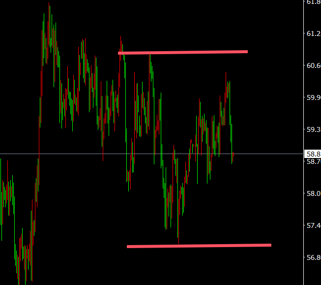 原油周一未能延续上涨,回调一波,当天最高60.2,最低58.6,日线,日线看油价呈大区间颤动,目前另有回调的空间,下方闭切57一线,四小时线,颤动,低位收十字星,先看58一线能否支柱住,小时线,颤动下行,目前低位颤动,上方闭切60一线,日内操作看颤动下行,核心看57一线